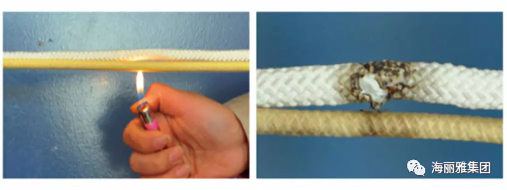 “海麗安心”防火逃生繩(黃色)與普通材料逃生繩(白色)防火實驗對比